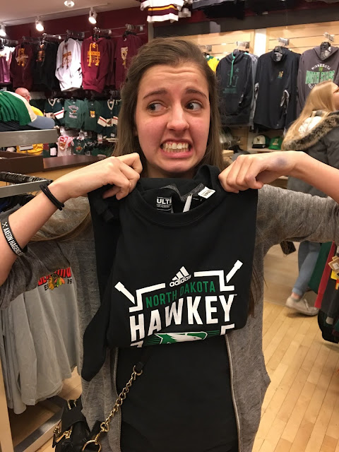Lauren enjoys looking at the Hockey Minnesota store when she visits the mall, and she pointed out this “lovely” North Dakota hockey shirt: